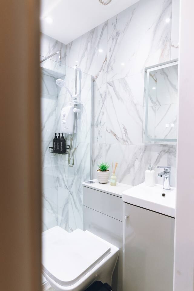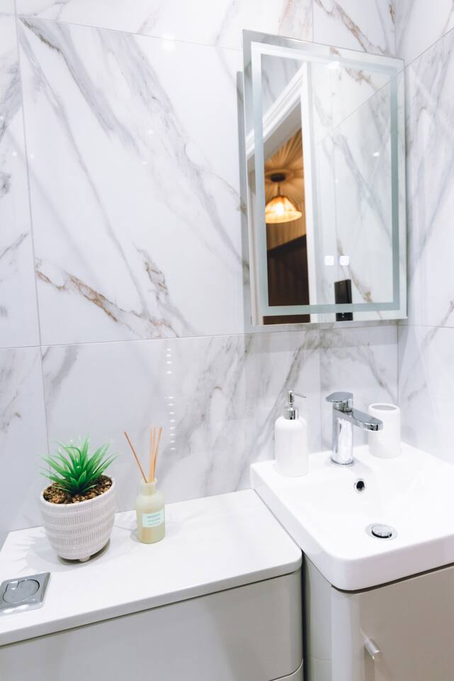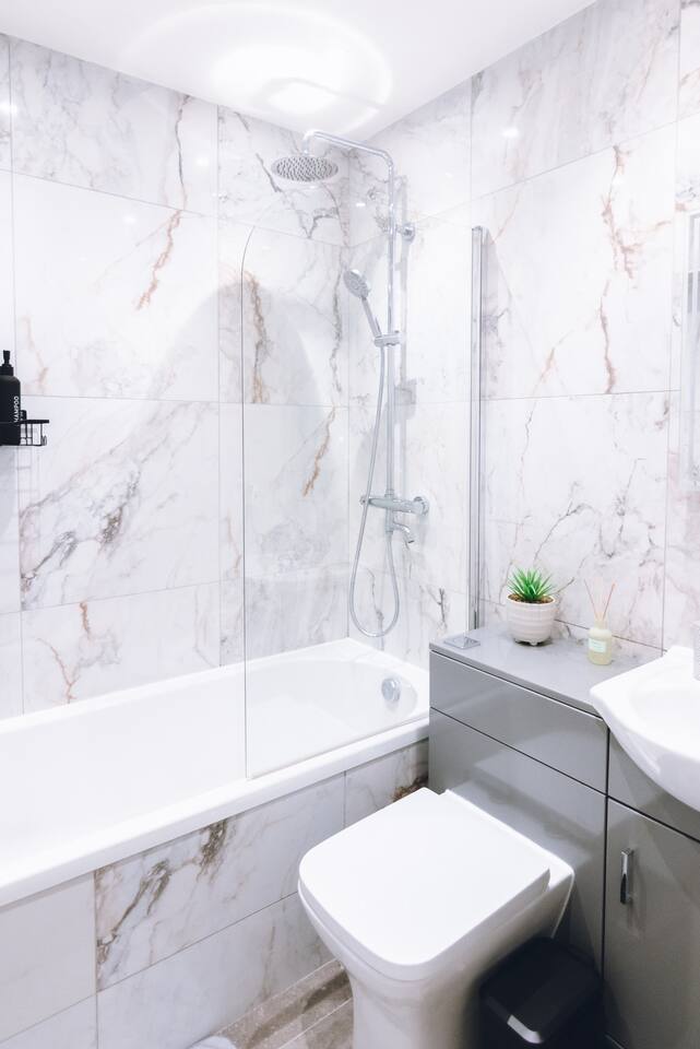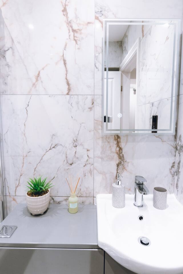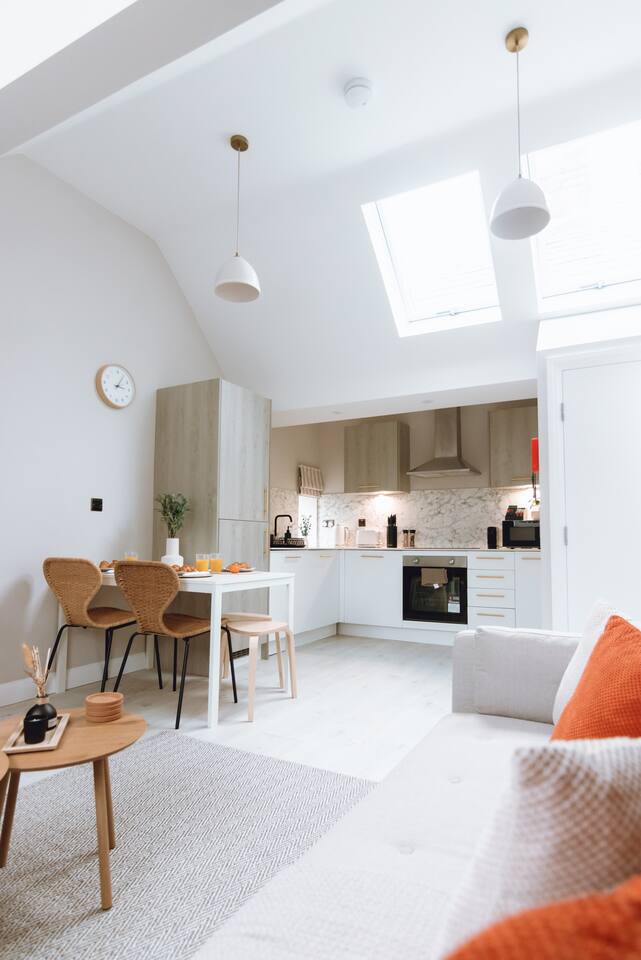✪ Living Space Bright and airy with high ceilings and Nordic-style decor. A cozy sofa and Smart TV create a comfortable space to relax after a long day. ✪ Bedrooms • Bedroom 1 – Double bed with soft linens and open wardrobe • Bedroom 2 – Zip-link bed (king or two singles), ideal for families or colleagues ✪ Bathrooms • Two modern bathrooms: one with a shower over bath, one en-suite with a walk-in shower • Fresh towels and complimentary toiletries provided ✪ Kitchen & Dining • Fully equipped with oven, microwave, fridge/freezer, kettle, and toaster • Cooking essentials, pots, pans, and tableware included • Extendable dining table (120cm-180cm), perfect for meals or work. ✪ Parking & Transport • Free off-street parking plus a reserved space • 5-minute walk to Davenport Station with direct trains to Manchester and Stockport • Quick access to the M60 and A6, ideal for business travelers and contractors. ✪ Prime Location • 9-minute drive to Stepping Hill Hospital, perfect for NHS staff and visitors • 5-minute drive to Stockport Town Centre for shopping, supermarkets, and dining • Restaurants, cafés, and bars within walking distance • Close to Manchester Airport and business hubs. ✪ Additional Amenities • High-speed WiFi and Smart TV • Self-check-in for a hassle-free stay • Washing machine inside the apartment • Heating for year-round comfort Book now for a stylish and seamless stay in Stockport